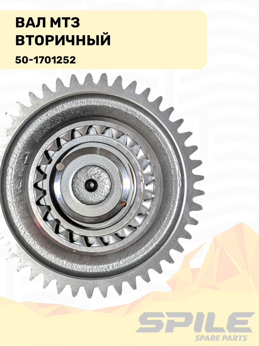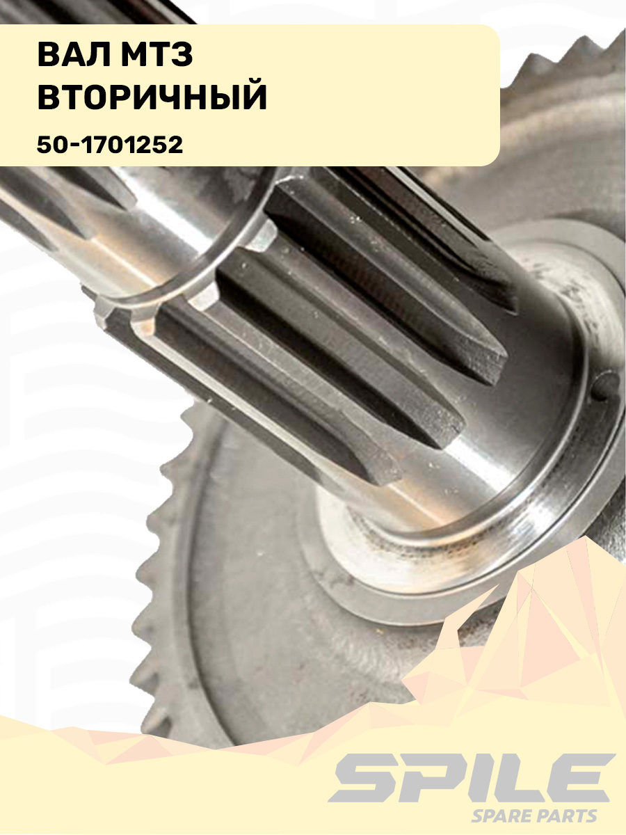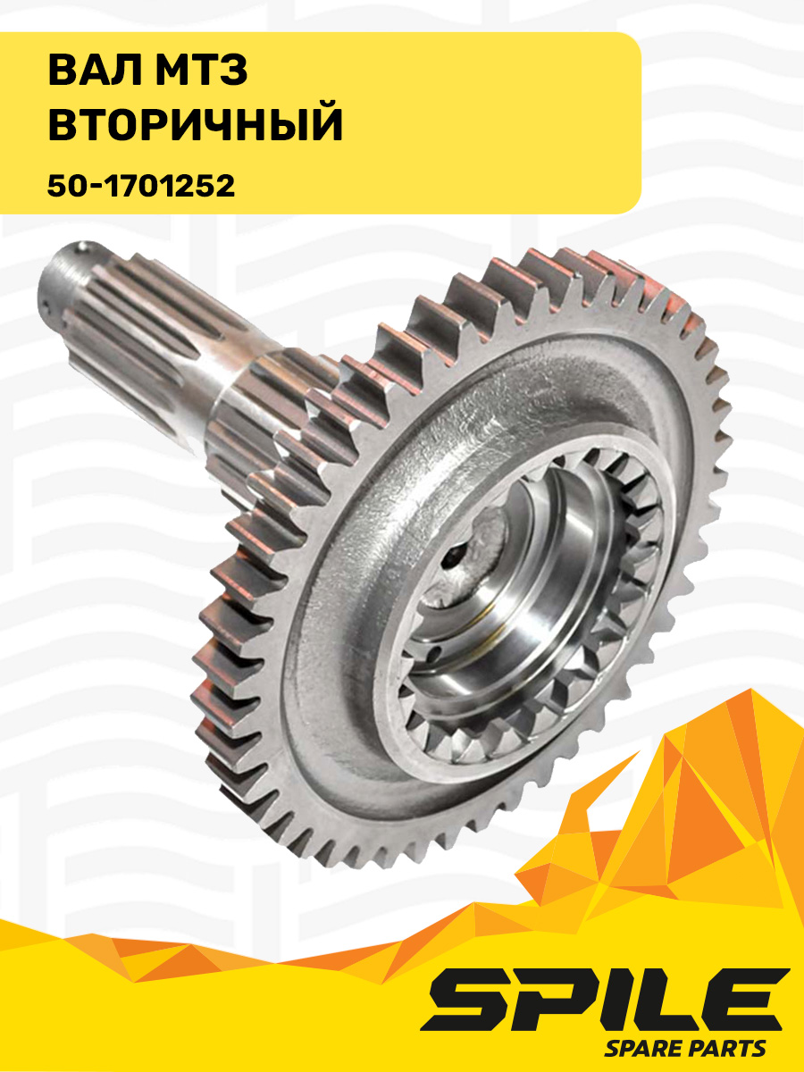 Вторичный вал коробки передач принимает вращение от промежуточного вала и через установленные на нём шестерни передаёт крутящий момент к дифференциалу и ведущим колёсам трактора. Это основной выходной вал КПП.