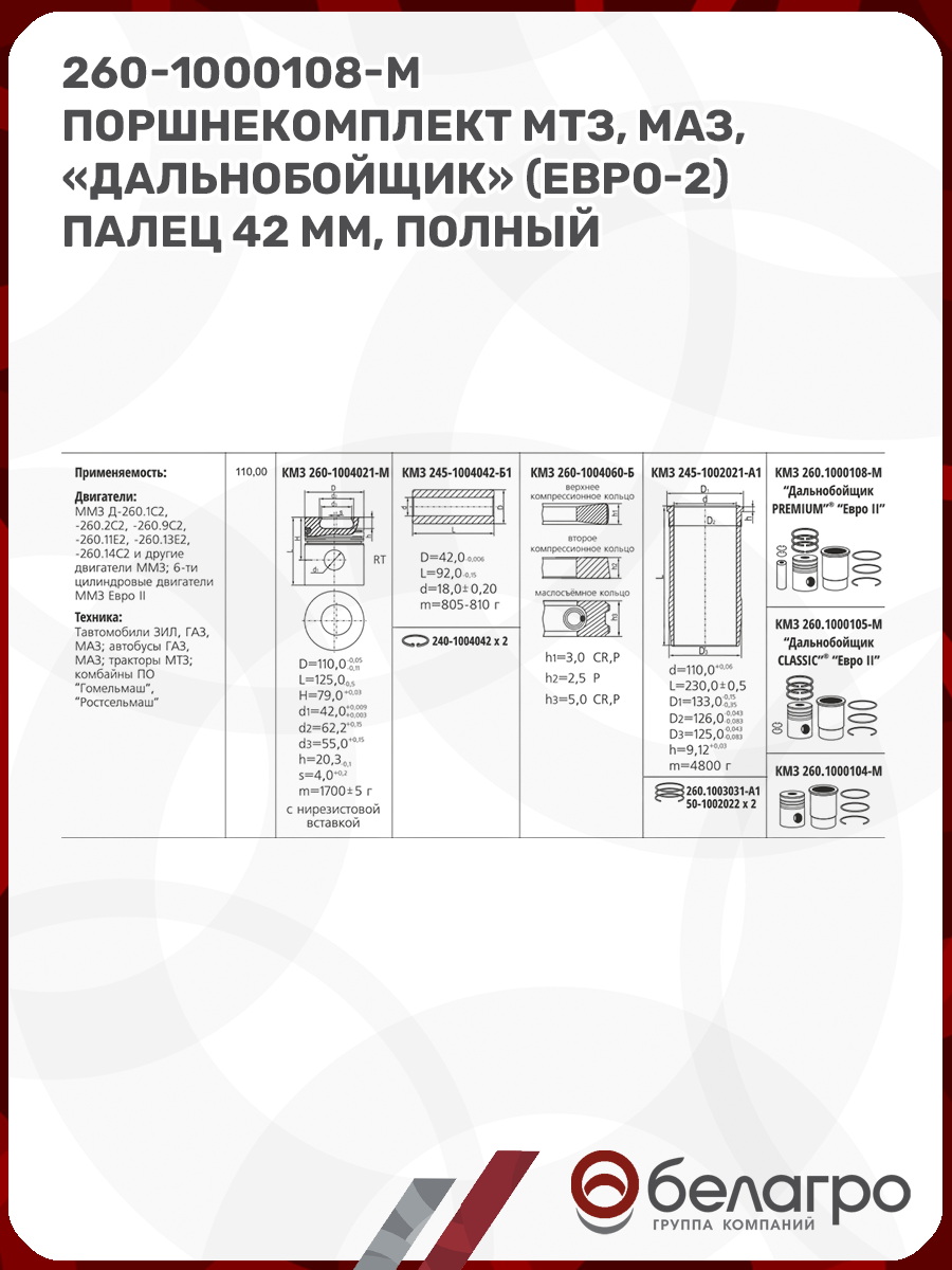 260-1000108-М Поршнекомплект МТЗ, МАЗ, "Дальнобойщик" (ЕВРО-2) палец 42 мм, полный комплект, РФ