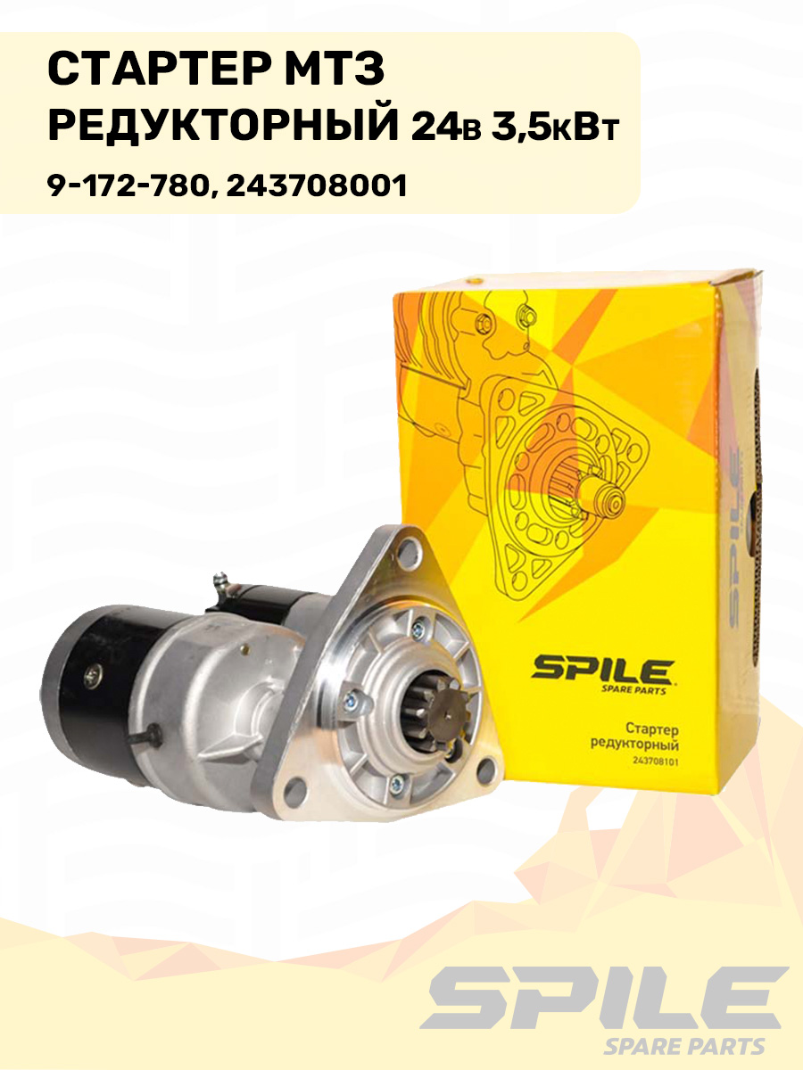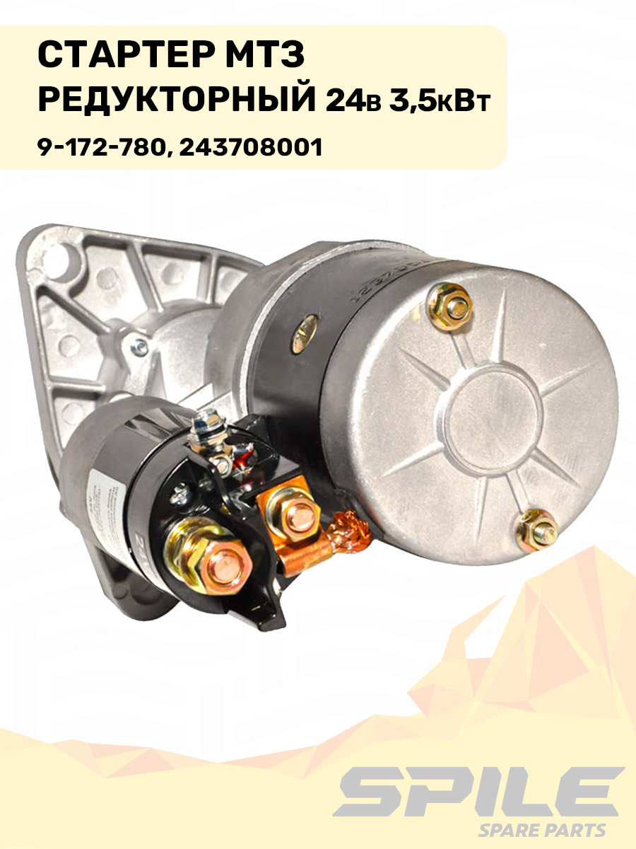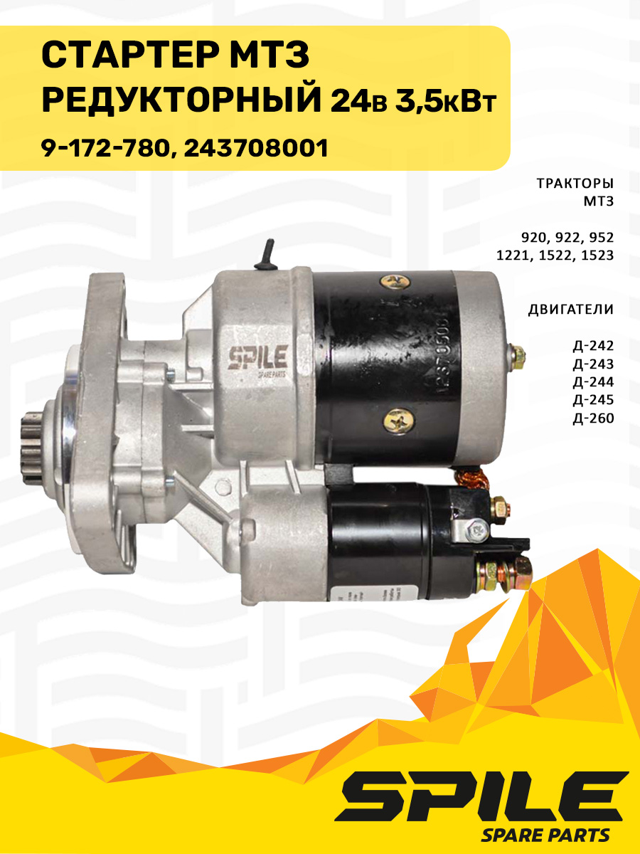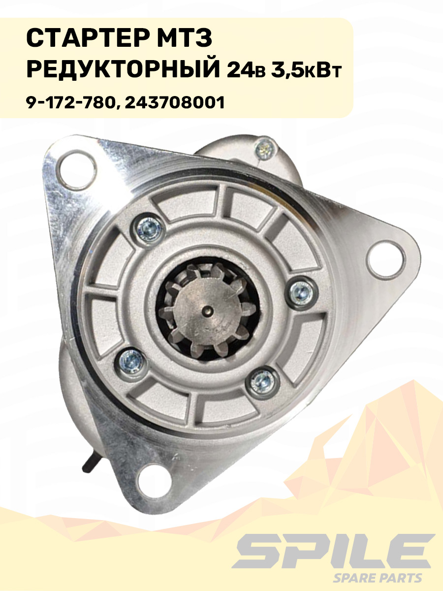 "Электростартер для пуска дизельных двигателей: передаёт крутящий момент на венец маховика через редуктор, обеспечивая уверенный запуск и сниженный пусковой ток.