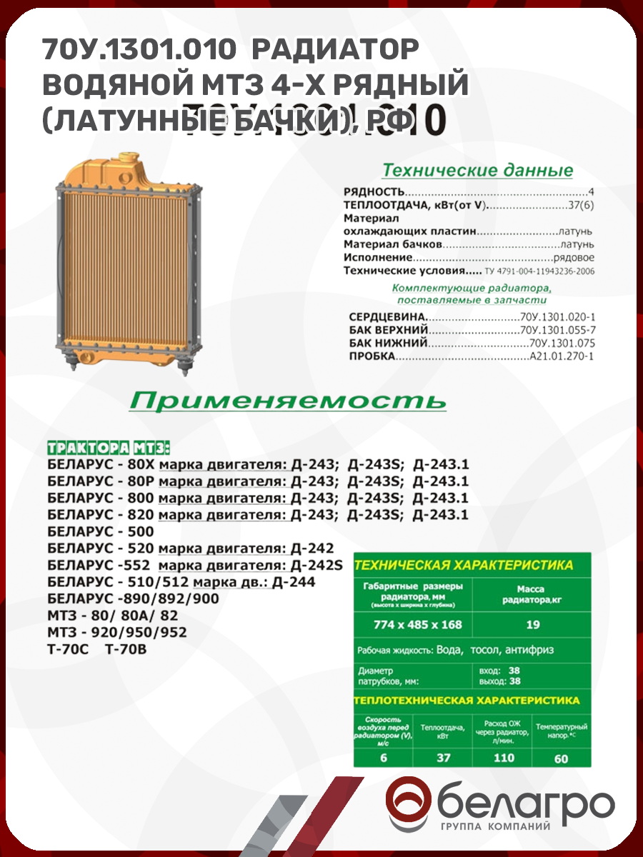 70У.1301.010 Радиатор водяной МТЗ 4-х рядный (латунные бачки), РФ