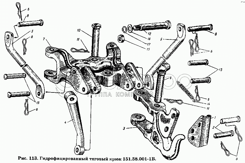 Каталог запасных частей к технике: ХТЗ Т-150К. Крюк тяговый гидрофицированный 151.58.001-1Б