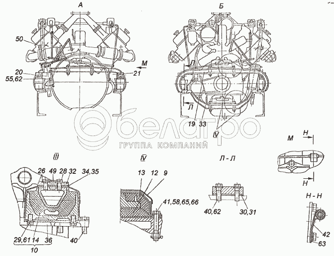 Каталог запасных частей к технике: ХТЗ Т-150К (2004). Установка двигателя