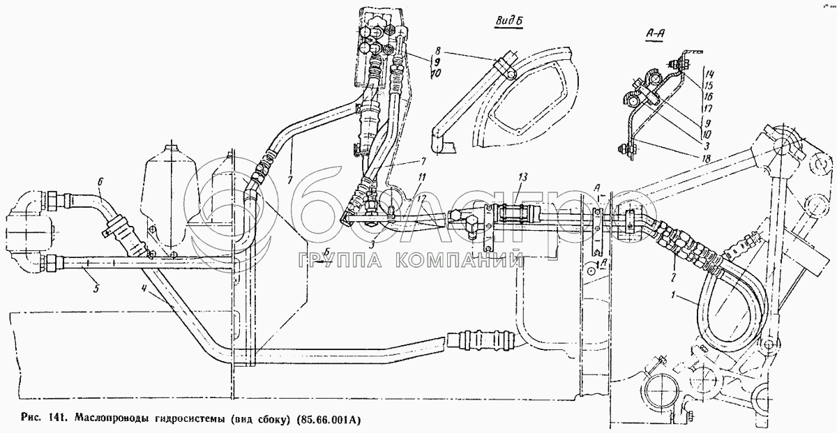 Каталог запасных частей к технике: ВгТЗ ДТ-75М. Маслопроводы гидросистемы (вид сбоку) (85.66.001А)