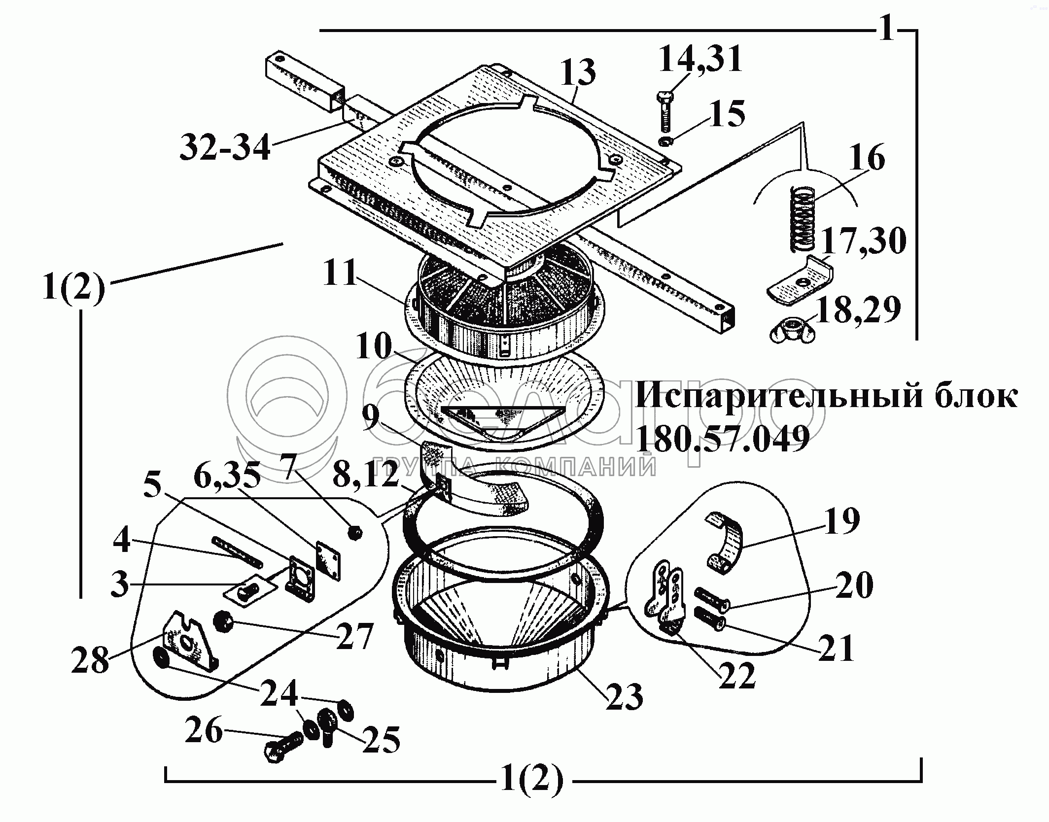 Каталог запасных частей к технике: ВгТЗ ВТ-100Д. Испарительный блок 180.57.049