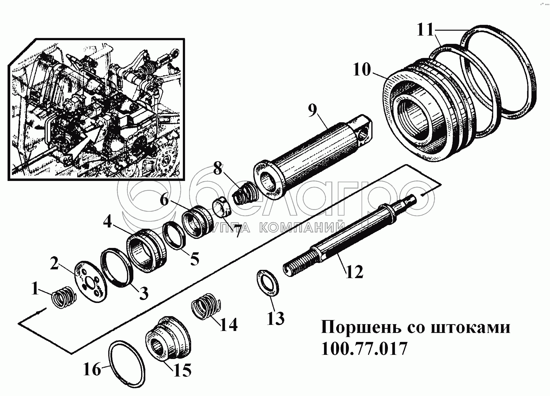 Каталог запасных частей к технике: ВгТЗ ВТ-100Д. Поршень со штоками 100.77.017