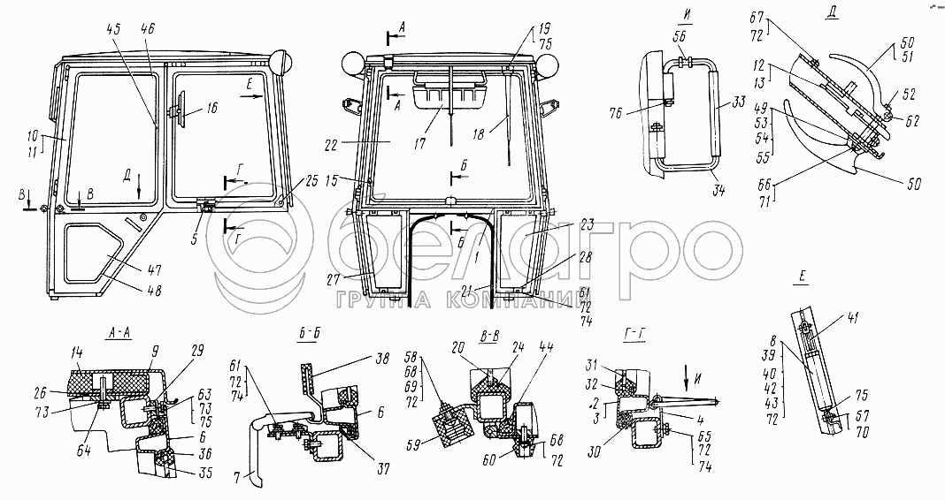 Каталог запасных частей к технике: ЮМЗ-6КЛ, (6КМ). Кабина. Каркас. Рамка задняя. Крыша. Двери