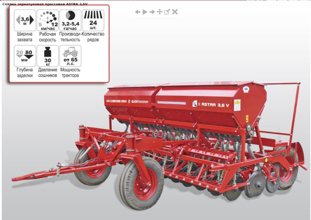 ASTRA 3,6V нового поколения имеет ряд преимуществ: - бункера для семян и удобрений с объемом увеличенным в 1,5 раза (туковые - 400 дм3, зерновые - 600 дм3); - систему бесступенчатой регулировки норм высева как семян, так и удобрений; - зерновые и туковые высевающие аппараты выполненные из полимерного материала; - комбинированные катушки зерновых высевающих аппаратов; - двухдисковые сошники со смещенными дисками из стали, которая содержит бор.